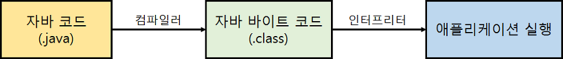 컴파일(Compile)이란 사람이 이해하기 쉬운 언어인 고급언어로 개발한 프로그램을 컴퓨터가 이해하기 쉬운 언어인 기계어로 바꿔주는 것을 말한다. 자바의 컴파일 과정은 간단하다. 개발자가 작성한 자바 코드(.java)를 컴파일러가 기계어인 자바 바이트 코드(.class)로 변환시켜 주고, 변환된 코드를 인터프리터가 한 줄씩 실행시키면서 애플리케이션을 실행하게 된다.