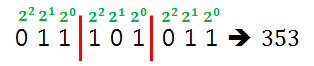- 2진수→8진수 : 뒤에서부터 3자리씩 끊어서 2^0, 2^1, 2^2을 곱해서 더해준다.