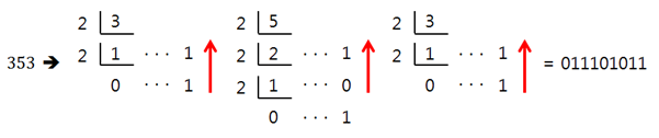 - 10진수→2진수 : 몫이 0이 될 때까지 2로 나누며 나머지를 구하고, 역순으로 표시한다.