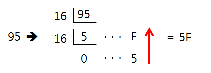 - 10진수→16진수 : 몫이 0이 될 때까지 16으로 나누며 나머지를 구하고, 역순으로 표시한다.