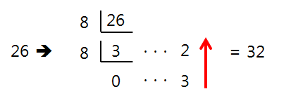 - 10진수→8진수 : 몫이 0이 될 때까지 8로 나누며 나머지를 구하고, 역순으로 표시한다.