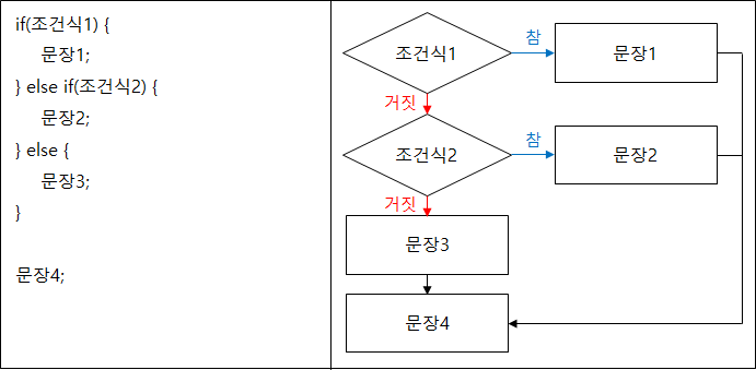 - if의 조건식이 참인 경우 if의 중괄호 안의 내용을 실행하고, if의 조건식이 거짓이고 else if의 조건식이 참인 경우 else if의 중괄호 내용을 실행. 그 외에는 else의 중괄호 내용을 실행