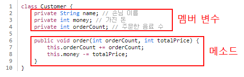 Line 6 ~ 9 : name과 money를 초기화시켜주는 생성자